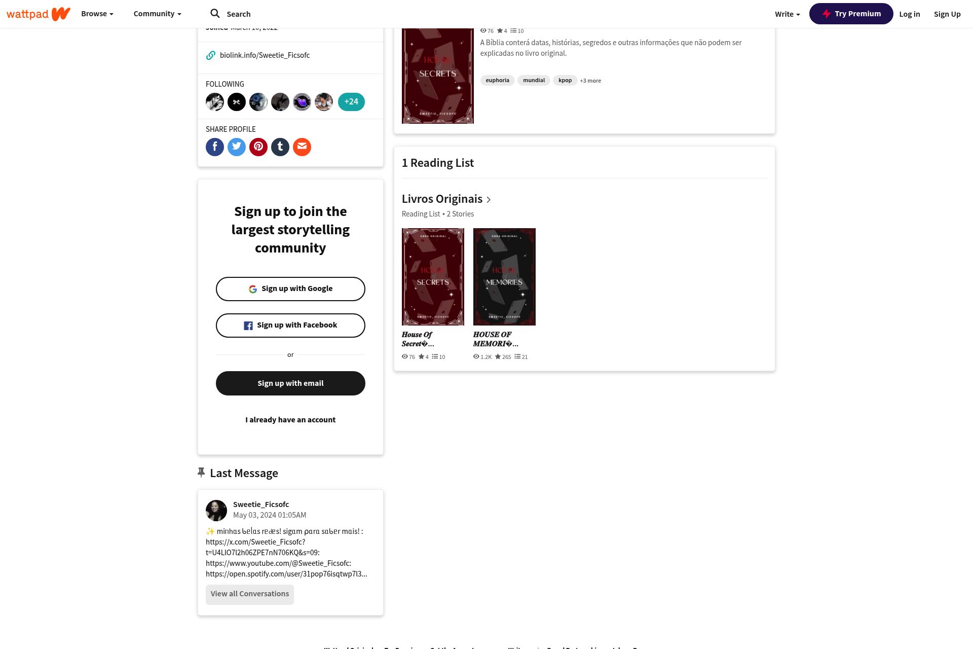 On Wattpad, Sweetie_Ficsofc has published two stories: "House of Memories" and "House of Secrets." "House of Memories" has garnered significant attention, with over 1,200 reads, 265 votes, and 21 comments. The synopsis reveals a narrative centered around Mikaelly Smith, who dreams of studying at a prestigious Canadian university. The story explores themes of fiction, romance, and drugs, among others. "House of Secrets," while newer, delves into a plot involving a Bible containing dates, stories, and secrets that defy explanation. This story touches on elements of K-pop, pop, and American culture. Sweetie's Wattpad profile also features a reading list titled "Livros Originais," indicating her interest in original works.
