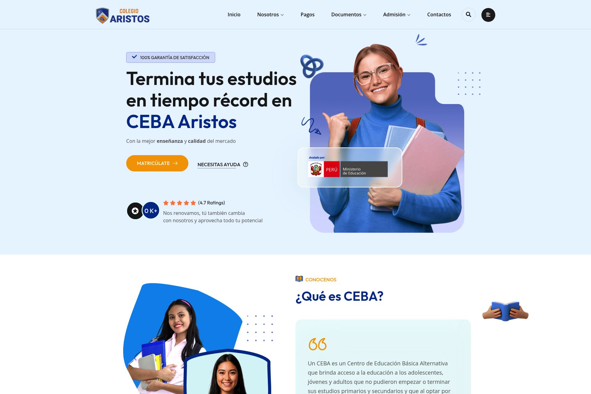 CEBA Colegio Aristos se distingue por ofrecer una educación inclusiva y de todo nivel, utilizando una metodología moderna y dinámica que facilita el aprendizaje y el desarrollo de habilidades en sus estudiantes. Una de las principales ventajas de estudiar en CEBA Colegio Aristos es la posibilidad de postular a programas de becas como BECA 18, una vez que se hayan concluido los estudios. Además, el colegio garantiza el valor oficial de los estudios ante el Ministerio de Educación (MINEDU), asegurando que todos los alumnos sean registrados como estudiantes del CEBA. La finalización de los estudios en CEBA Colegio Aristos también abre las puertas a oportunidades en las Fuerzas Armadas y Policiales, así como a la admisión en universidades e institutos de educación superior.