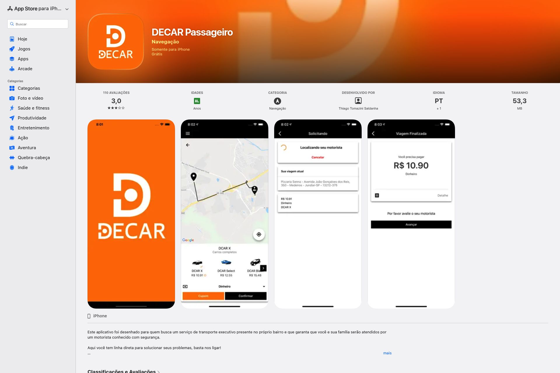 O aplicativo DECAR Passageiro, disponível na App Store, foi desenvolvido por Thiago Tomazini Saldanha e oferece uma plataforma intuitiva para solicitar viagens. O app permite que os usuários chamem um dos veículos da DECAR e acompanhem o seu deslocamento em tempo real através do mapa. Além disso, o usuário é notificado quando o carro está próximo, proporcionando maior comodidade e controle sobre a sua experiência de transporte. Uma característica importante é a transparência, onde o usuário pode visualizar todos os veículos próximos, com informações sobre a disponibilidade de cada um.