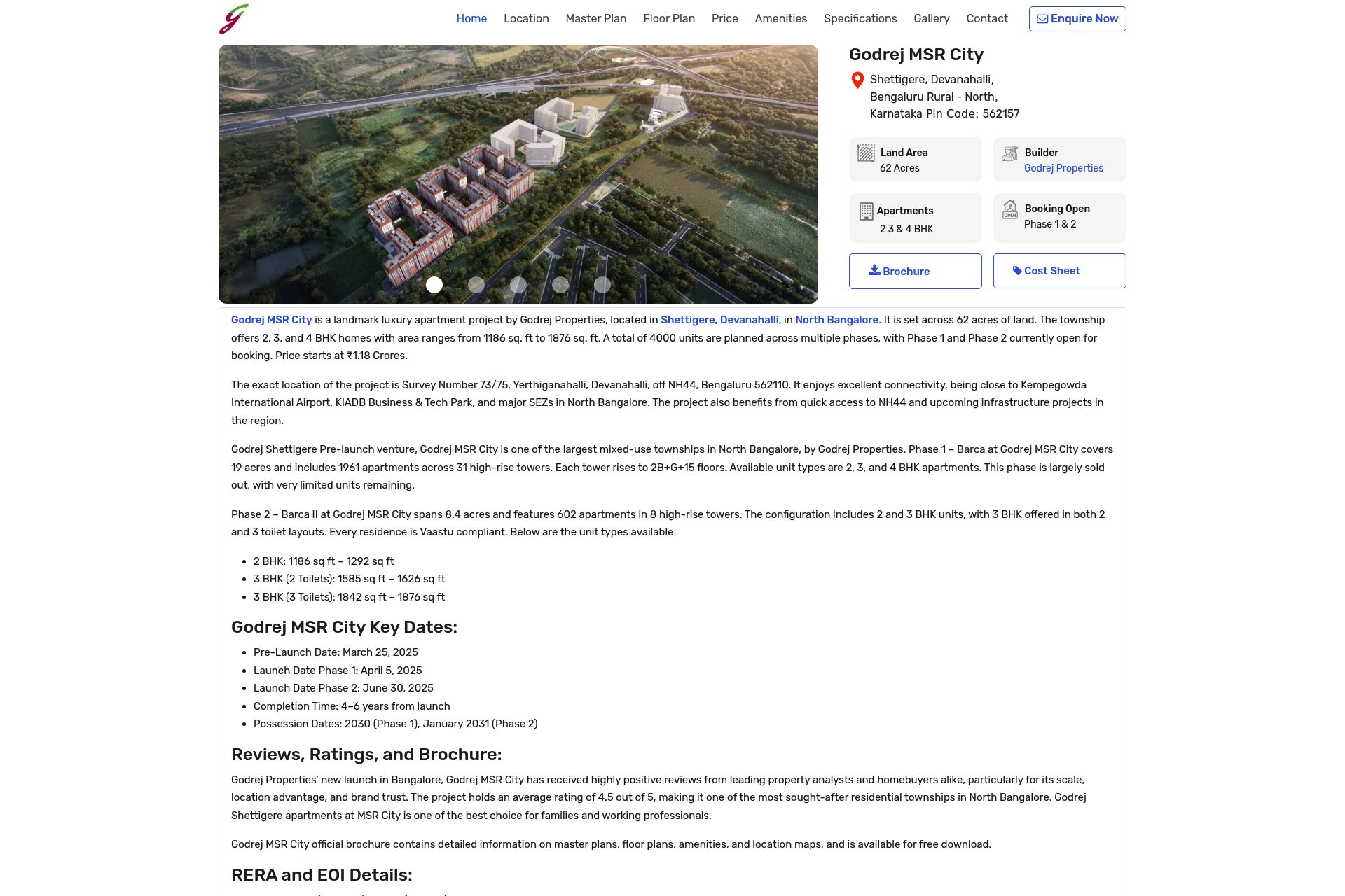 Godrej MSR City is a large-scale residential project by Godrej Properties located in Shettigere, Devanahalli, North Bangalore. This expansive township is set across 62 acres and offers a variety of housing options, including 2, 3, and 4 BHK apartments. With a total of 4,000 units planned across multiple phases, the development aims to provide a comprehensive living experience with modern amenities and excellent connectivity. Currently, Phase 1 and Phase 2 are open for booking, with prices starting at ₹1.18 Crores. The project's strategic location near Kempegowda International Airport and major IT hubs makes it an attractive option for professionals and families seeking convenience and comfort.