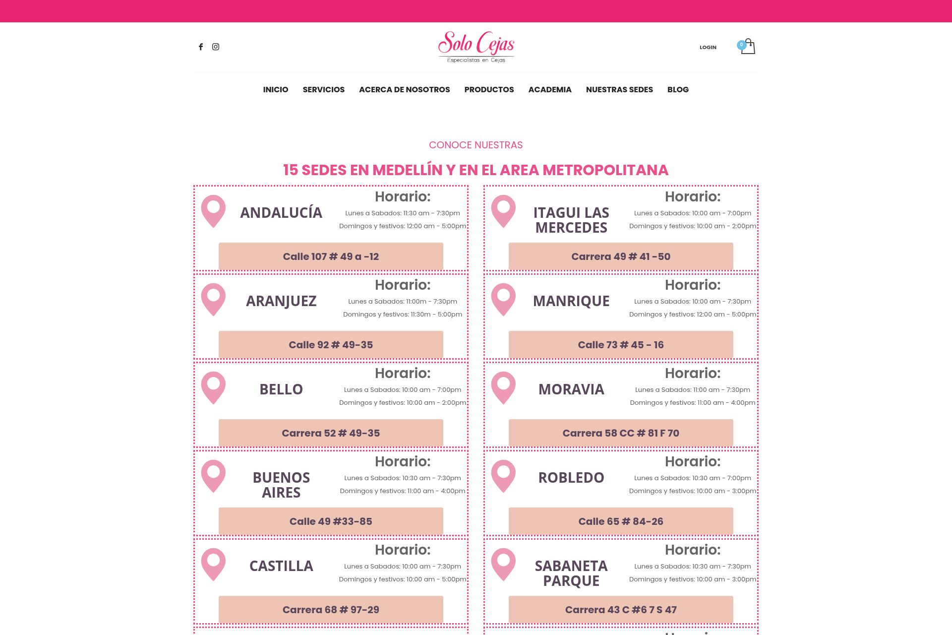Solo Cejas Medellín es una empresa con 15 sedes en Medellín y el Área Metropolitana, especializada en servicios de embellecimiento de cejas. Cuentan con una amplia variedad de sedes distribuidas en diferentes zonas, como Andalucía, Aranjuez, Bello, Buenos Aires, Castilla, Envigado, Itagüí, Manrique, Moravia, Robledo, Sabaneta, y Laureles, entre otras. Cada sede tiene un horario específico de atención que varía de acuerdo al día de la semana, ofreciendo flexibilidad para sus clientes. Además, la empresa cuenta con una academia donde se imparten cursos relacionados con el cuidado y embellecimiento de cejas.