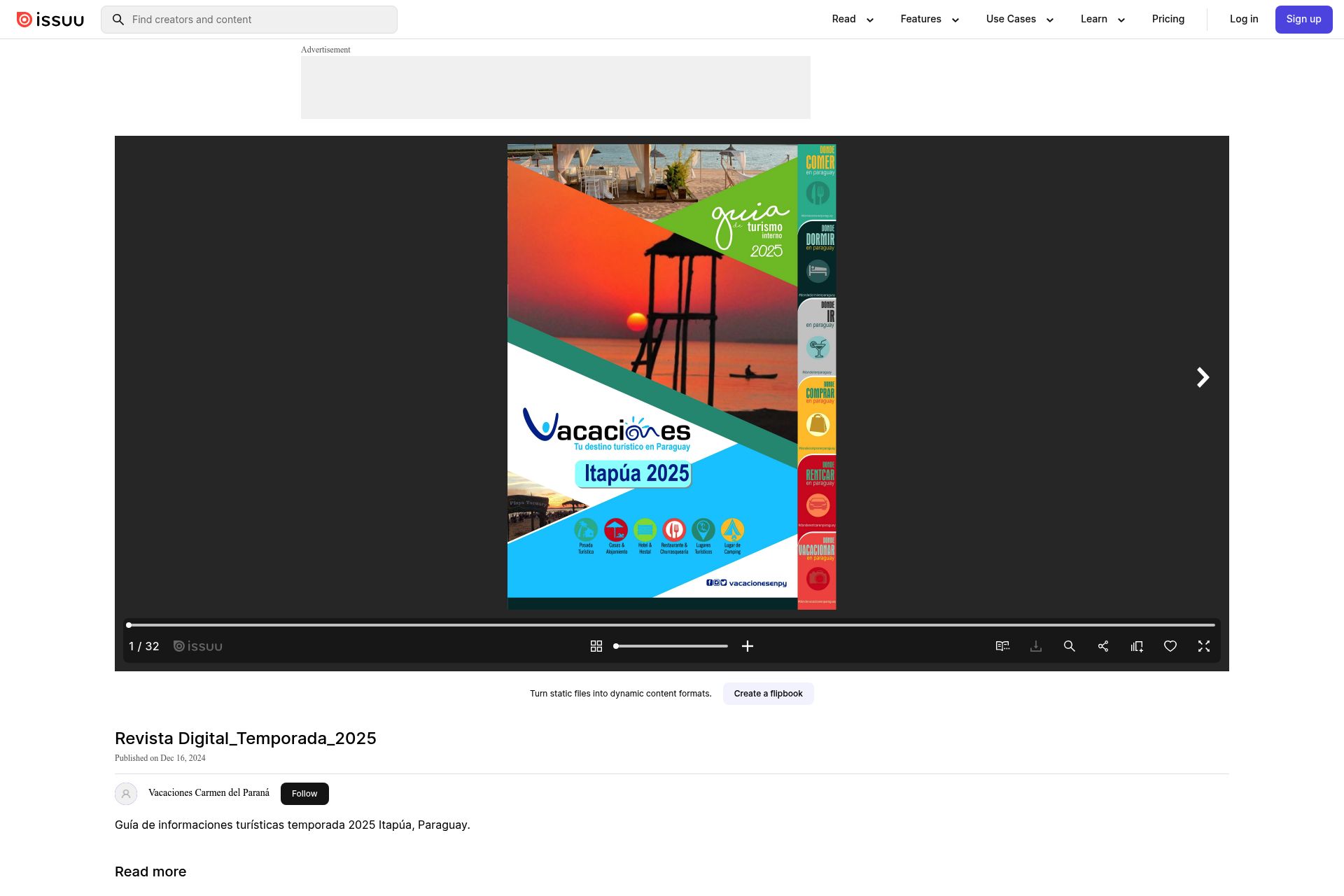 Issuu, la plataforma que alberga la guía digital de Vacaciones en Carmen del Paraná, se destaca por su capacidad para crear flipbooks interactivos y contenido atractivo para diversos canales de distribución. Con la premisa de "crear una vez y compartir en todas partes", Issuu convierte archivos PDF y otros formatos en experiencias de lectura envolventes. Además, la plataforma ofrece recursos adicionales, como un blog con noticias del producto, consejos, recursos y entrevistas relacionadas con el marketing de contenido y la publicación, así como webinars gratuitos y una amplia gama de características y herramientas para satisfacer las necesidades de editores, diseñadores, vendedores y gestores de redes sociales.